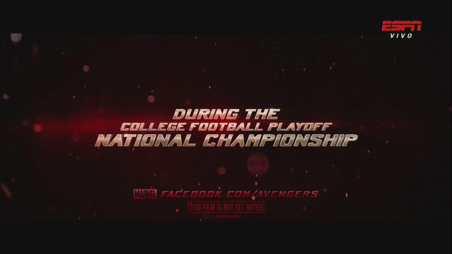 Now that we're finally in the year of the highly-anticipated release of Avengers: Age of Ultron, which is exactly four short months away, promotion for the Marvel sequel is expected to kick into high gear. However, it seems Marvel/Disney will get things started early, and before the usual TV spot during the Super Bowl game on February 1, 2015. According to a commercial that just aired during the Rose Bowl football game on ESPN, the sports channel will air a new Age of Ultron trailer on January 12, during the BCS National Championship game at 8:30 pm. What do you think?