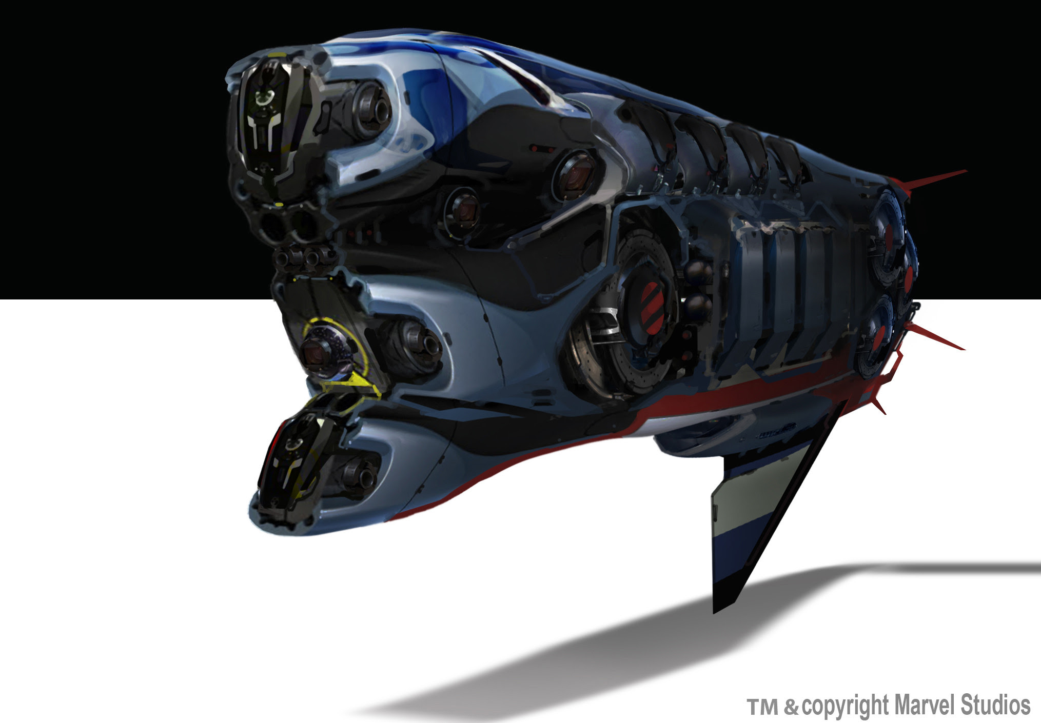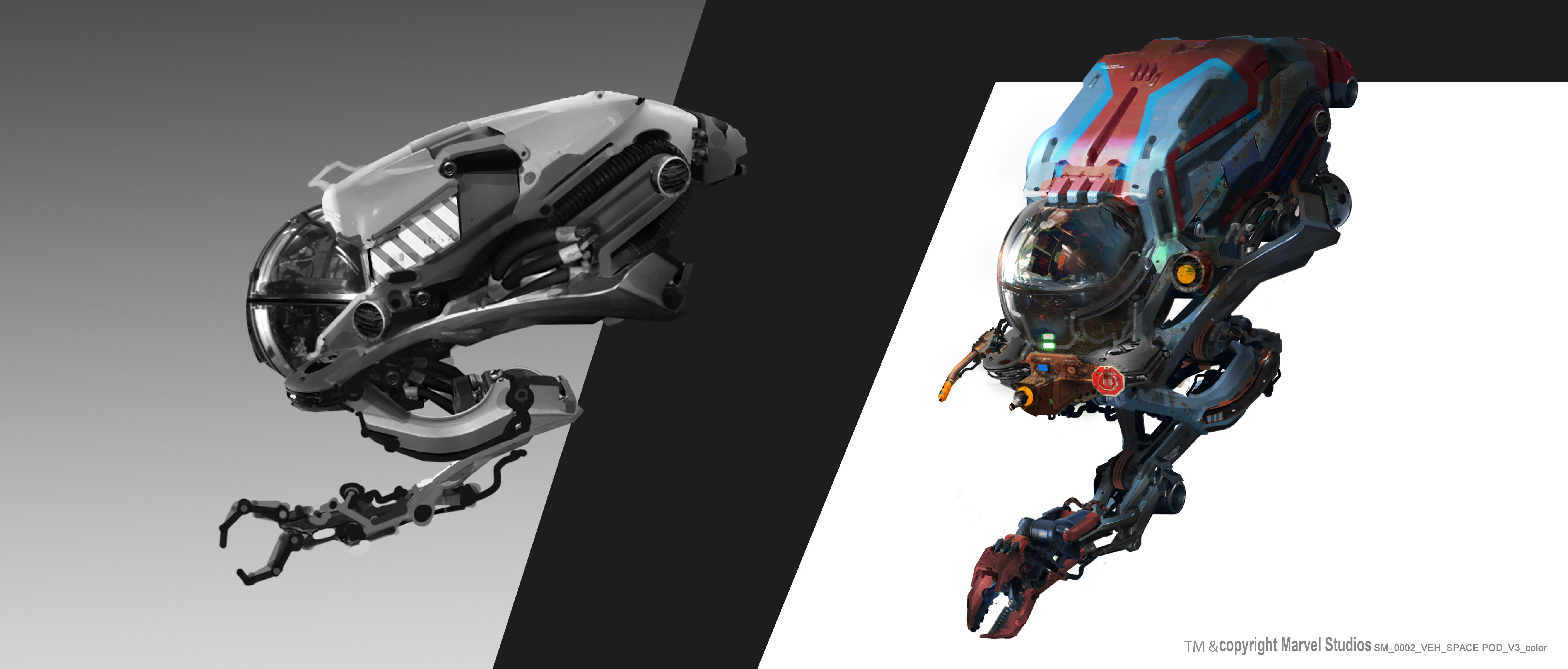 In Marvel's Guardians of the Galaxy, while Drax (played by Dave Bautista) is fighting Ronan (played by Lee Pace) on Knowhere there is anothere sequence taking place at the same time. It involved Rocket (voiced by Bradley Cooper) and Peter Quill/Star-Lord (played by Chris Pratt) flying around in industrial space-pods battling Ronan's forces who are flying around in Necrocrafts. Below, are some designs for the pods. Check it out.